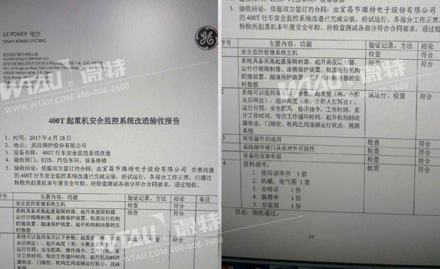 武漢鍋爐股份有限公司前身為始建于1954年的武漢鍋爐廠,2015年通用電氣完成對阿爾斯通電力與電網業務的收購,武漢鍋爐股份有限公司正式成為GE發電集團蒸汽電力系統旗下的一員,公司具備研發、設計、生產600MW超臨界鍋爐,1000MW超超臨界鍋爐以及大型循環流化床鍋爐的能力,其400t橋機是在鍋爐生產過程中的核心起吊設備,具有噸位大,跨度大,起升高度高等特點,出于起吊安全考慮,武鍋上下對此非常重視,經過多方對比,考慮到微特電子自身的技術實力以及在市場上的口碑等多方因素,決定將此項目交由微特電子來做,最終微特公司不負期望,以高質量的產品和服務贏得了武鍋相關領導和特檢院的贊許。