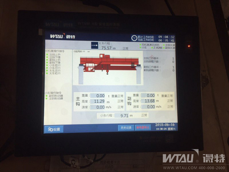 微特為大冶有色配備的WTSM-A型冶金橋式起重機安全監(jiān)控管理系統(tǒng),該系統(tǒng)具有實時監(jiān)控、動態(tài)顯示、聲光報警、數(shù)據(jù)備份、斷電記憶以及密碼保護等功能,且具有抗干擾性強,操行界面友好,通用性強等優(yōu)點。項目目前已得到當(dāng)?shù)刭|(zhì)監(jiān)局和使用方的驗收認(rèn)可,業(yè)主對此次合作表示非常滿意。
