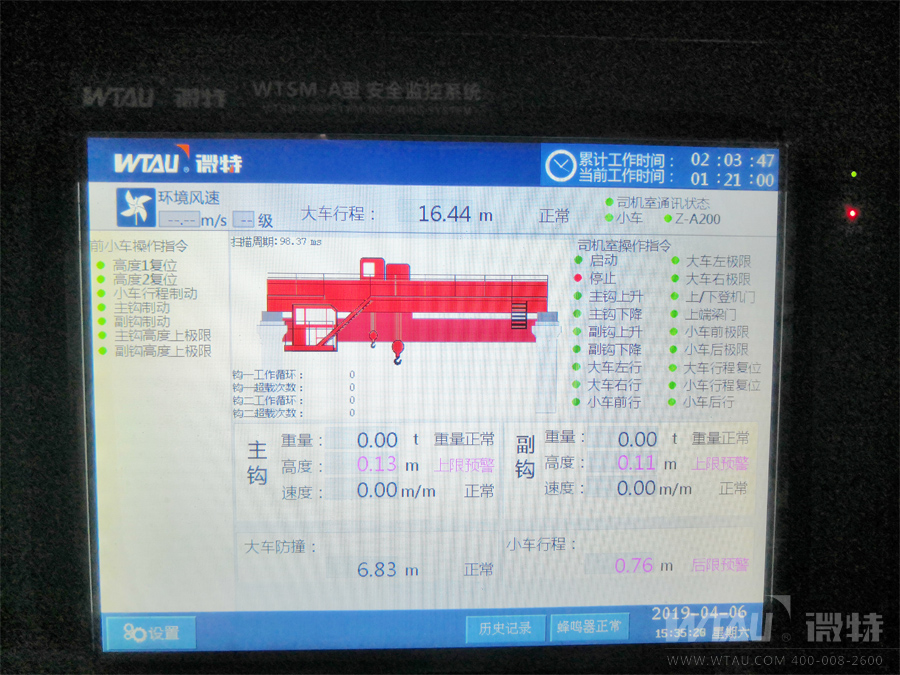 微特WTSM-A型起重機(jī)安全監(jiān)控系統(tǒng)具有實時監(jiān)控,動態(tài)顯示,聲光報警,數(shù)據(jù)存儲,斷電記憶以及密碼保護(hù)等功能,且儀表本身設(shè)計具有抗干擾性強(qiáng),操作界面方面,通用性強(qiáng)等優(yōu)點。經(jīng)過微特技術(shù)工程師的現(xiàn)場安裝調(diào)試完后順利通過了客戶及當(dāng)?shù)靥貦z機(jī)構(gòu)的驗收,贏得了客戶的認(rèn)可,也為我們今后在淄博地區(qū)業(yè)務(wù)的深入開展起到了一個良好的開端。