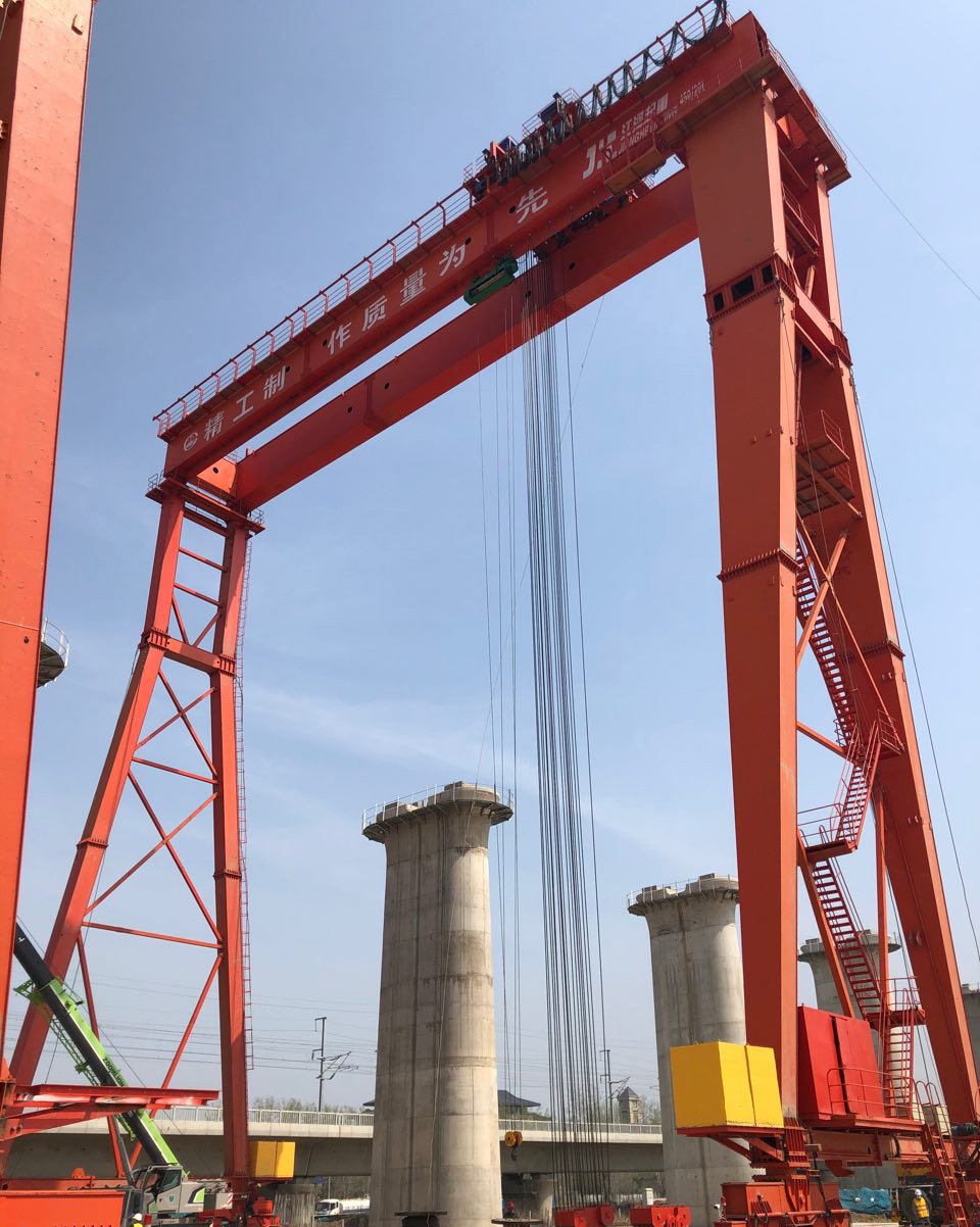 提梁機是一種為橋梁建設而專門設計的一種門式起重機,提梁機既可兩臺配合抬吊預制梁,也可以單臺起重機配雙吊具起吊預制梁,主要用于將預制梁從制梁臺提吊至存梁臺位,預制梁養護完成后將其從存梁臺位吊運到運梁車上。