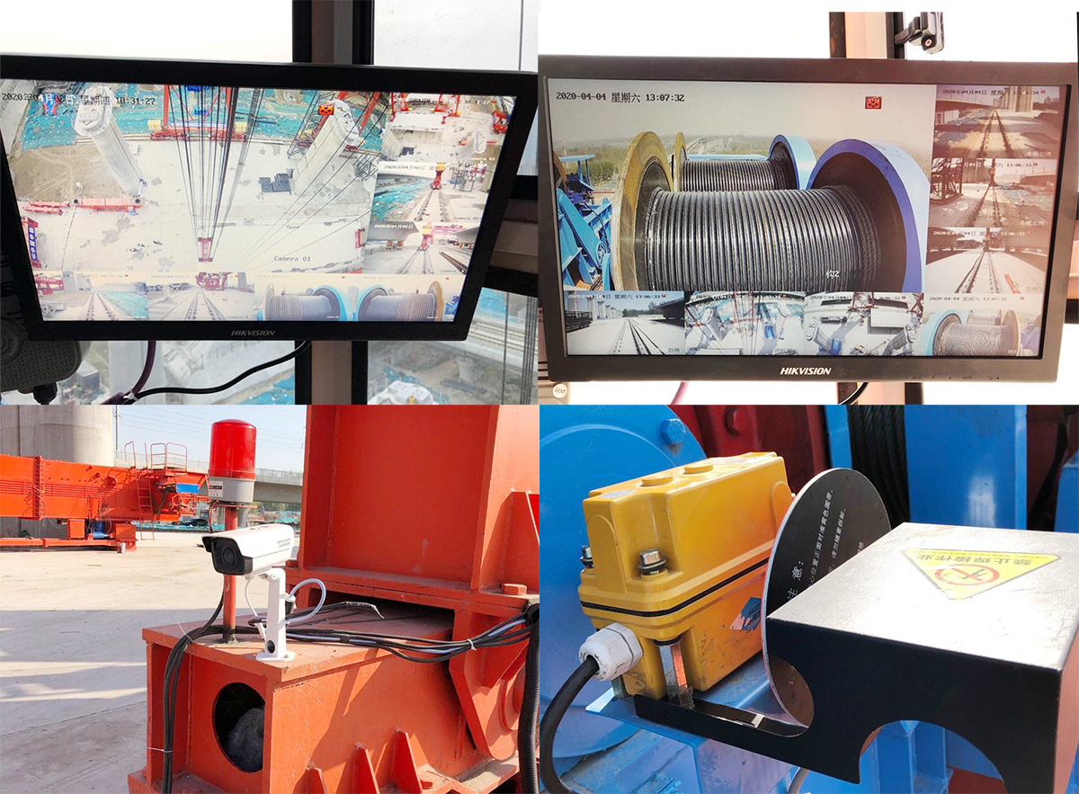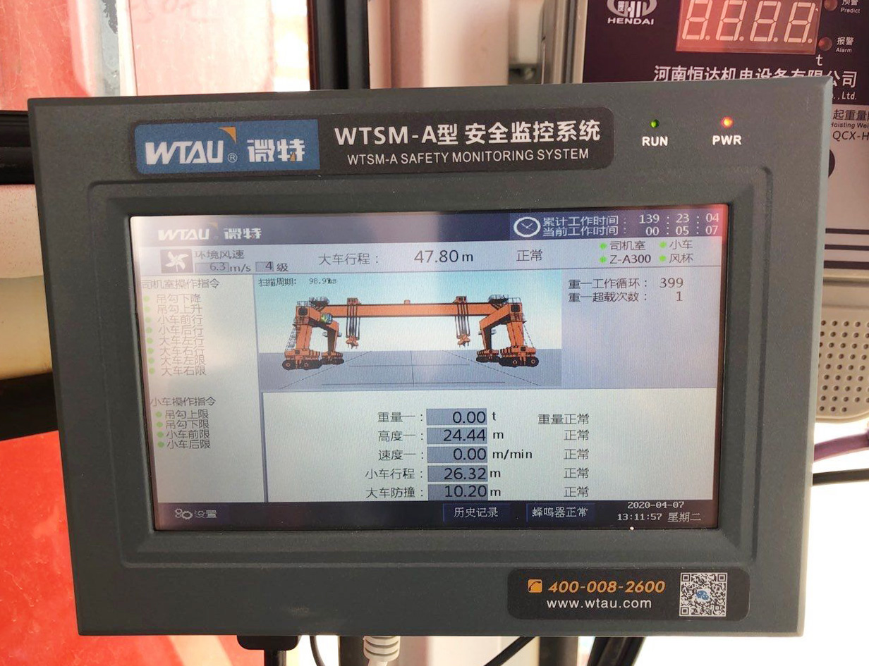 微特為該提梁機配裝的安全監控系統對該設備的安全可靠運行起著重要作用。微特研發的提梁機安全監控系統對設備的運行數據進行實時監控,該儀表可以顯示提梁機的起升高度,起重量,速度,大車行程,小車行程,同軌道防碰撞,風速,工作次數,超載次數等相關數據實時顯示,并對相關數據進行分析判斷,防止設備向不安全區域運行。當往不安全區域運行時,該系統首先會預警,并發出聲光報警提醒操作人員,并根據實際情況啟動控制功能,使設備相關運行機構停止運行,以起到保護作用。