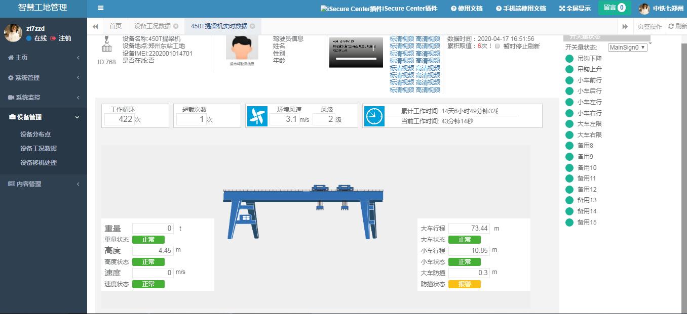 該系統還支持遠程管理,用戶可以通過手機端,PC端遠程查看設備數據,設備位置,違章記錄,歷史記錄,實時視頻數據,人員管理等強大的遠程管理能力,實現對故障進行自我診斷,對設備可能出現的危險進行有效預警,對發生故障的設備依據歷史數據分析功能進行遠程診斷和故障修復,全面的提高大型設備運行的安全性。
