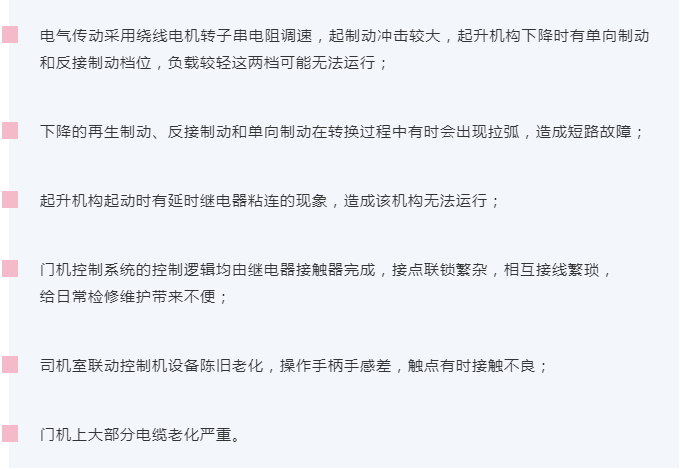 金銀臺樞紐1250T雙向門機電氣控制系統(tǒng)于2012年投運至今已有8年,控制系統(tǒng)元器件老化,部分元器件已停產(chǎn),無法提供備件,控制線路老化,可靠性降低,影響設備安全運行,無法滿足設備安全生產(chǎn)的需要。原控制系統(tǒng)設計性能差,操作系統(tǒng)容易出故障,啟動沖擊較大,平穩(wěn)性差。據(jù)現(xiàn)場調(diào)研主要存在以下問題: