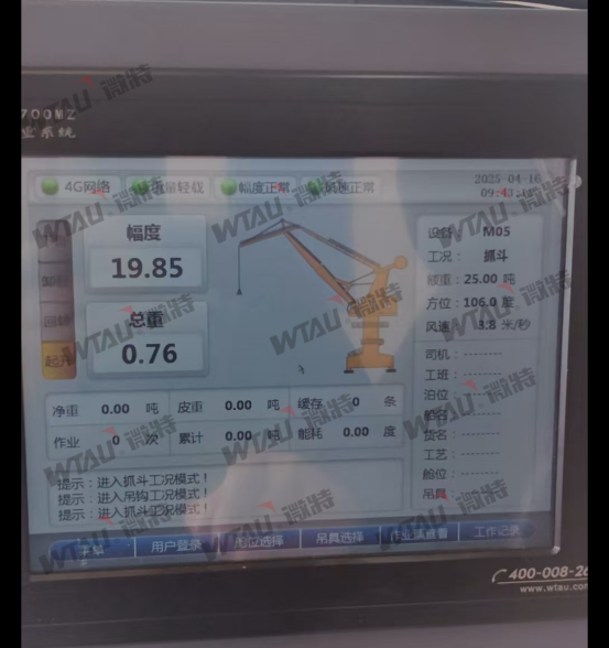 微特動態稱重系統通過接入重量傳感器實現精準計量,吊裝精度≤0.87%;視頻監控從單一吊點擴展到整車關鍵機構,實現全方位覆蓋;搭配10.4寸大觸摸屏與圖形化界面,操作便捷且便于查詢事件故障;作業數據實時傳輸至服務器,支持生成月度報表輔助績效考核,實現智能高效協同。