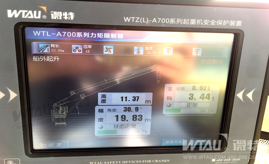 上圖為微特電子配備的WTL-A700型力矩限制器顯示儀,該型號(hào)儀表采用8寸TFT LCD觸摸屏,SG高耐蝕性熱鍍層鋼板機(jī)身,鋁合金面板;IP65防水性,最大800X600(V)像素;可動(dòng)態(tài)仿真的顯示當(dāng)前重量、幅度、角度、額重、工況等參數(shù)。并可外接PLC,智能儀表,板卡,模塊,變頻器等工業(yè)自動(dòng)化設(shè)備。顯示儀自帶8M內(nèi)存,并可擴(kuò)展外部記錄SD卡。