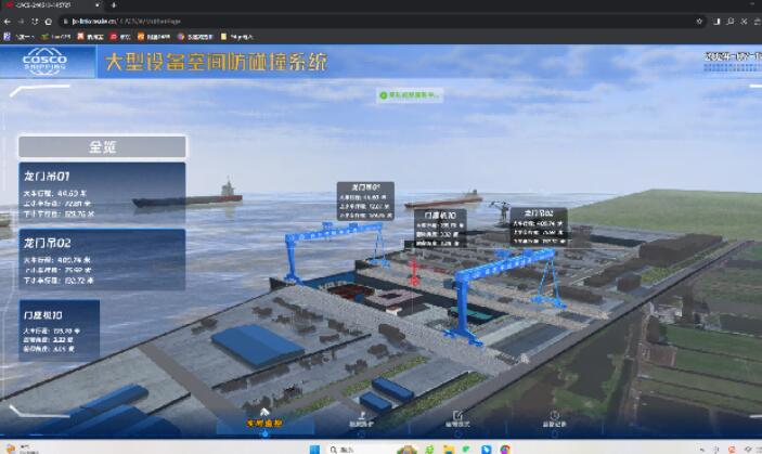 需要做集中集控管理的用戶,系統還需配置遠程三維監控平臺。將船塢組裝場地進行三維場景模型處理,且需保證關鍵位置(如軌道位置關系等設備運行活動范圍)與設備產生空間關系的區域,按照1:1精確建模,并展示上做突出處理,保證能準確、清晰地反映設備當前工況。