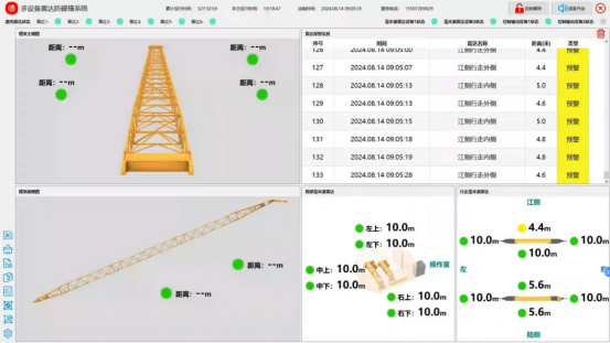 通過雷達主動監測起重機易碰運動部位路徑,探測區域空間內是否有障礙物,以此來避免吊機與吊機間,回轉部位與其它物體、臂架與周邊物體之間的區域空間是否安全,在安全區被入侵時發出聲、光報警,甚至給出止停控制信號,實現主動防碰撞監測保障設備安全。
