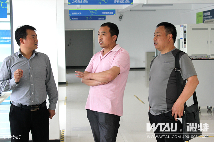 微特電子總經理聶道靜對兩位遠道而來的貴客表示歡迎,微特水電事業部經理韓信與技術工程師劉普文向郭永崗、田國強詳細介紹了微特電子的發展歷程及產品技術。同時還一同來到微特建設的智能吊裝設備研發檢測中心,參觀高溫老化實驗機、雷擊浪涌、靜電測試、振動實驗等實驗檢測設備。這些實驗設備是微特電子高品質產品的保證,確保每一臺出廠的設備都是百分百合格。
