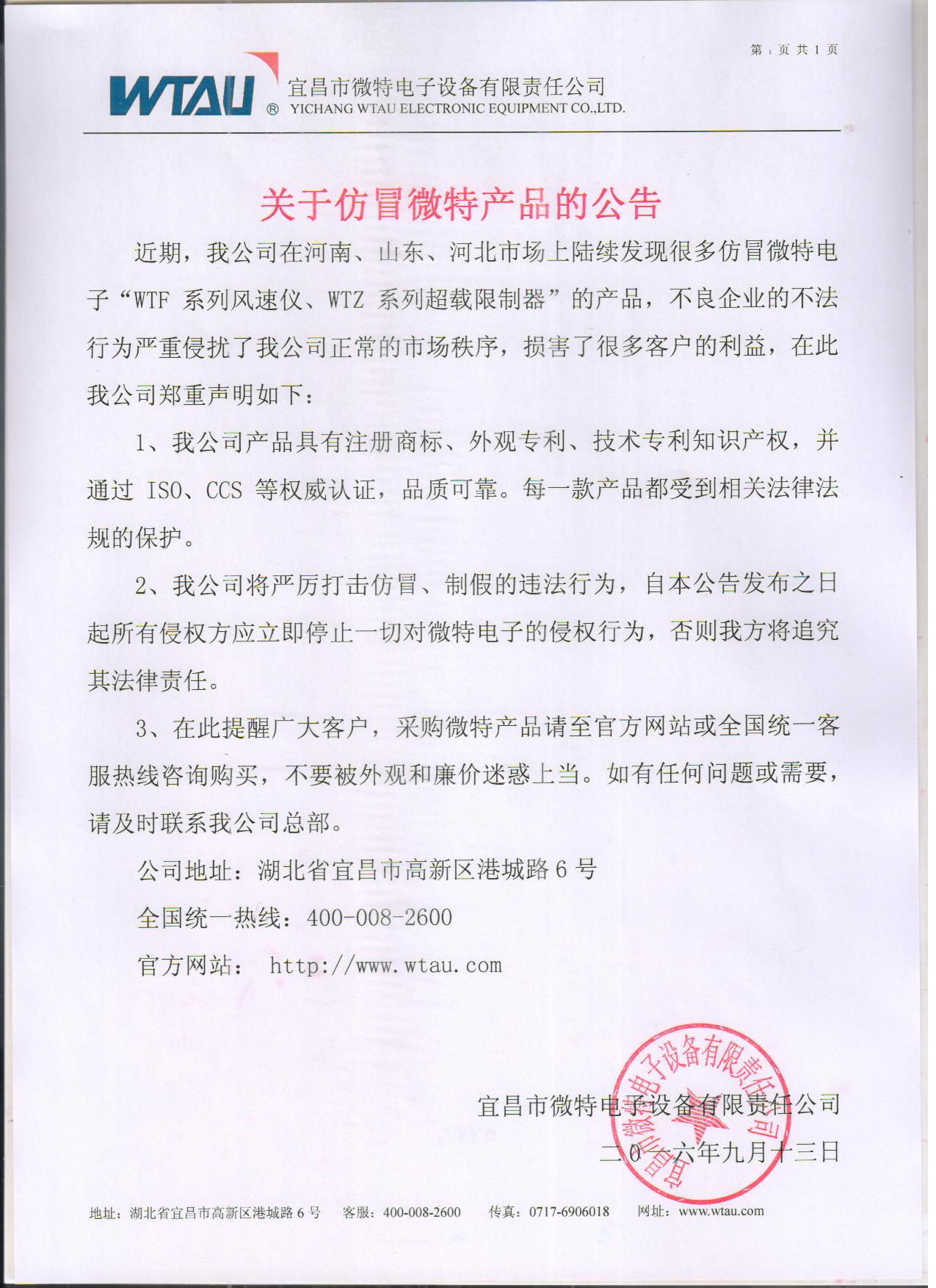 近期,我公司在河南、山東、河北市場上陸續發現很多仿冒微特電子“WTF系列風速儀、WTZ系列超載限制器”的產品,不良企業的不法行為嚴重侵擾了我公司正常的市場秩序,損害了很多客戶的利益,在此我公司鄭重聲明如下:
