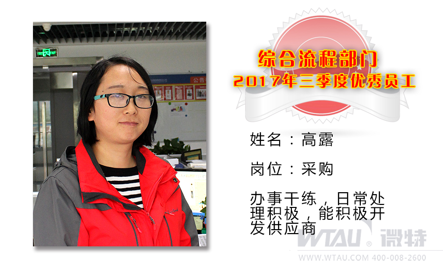 三季度先進提名:生產部:楊開翔;儀表設計部:蔡小雨;聲波&市場營銷:倪秀;綜合流程部:劉滿君、陳曉燕 ;微特智慧谷:萬澤容