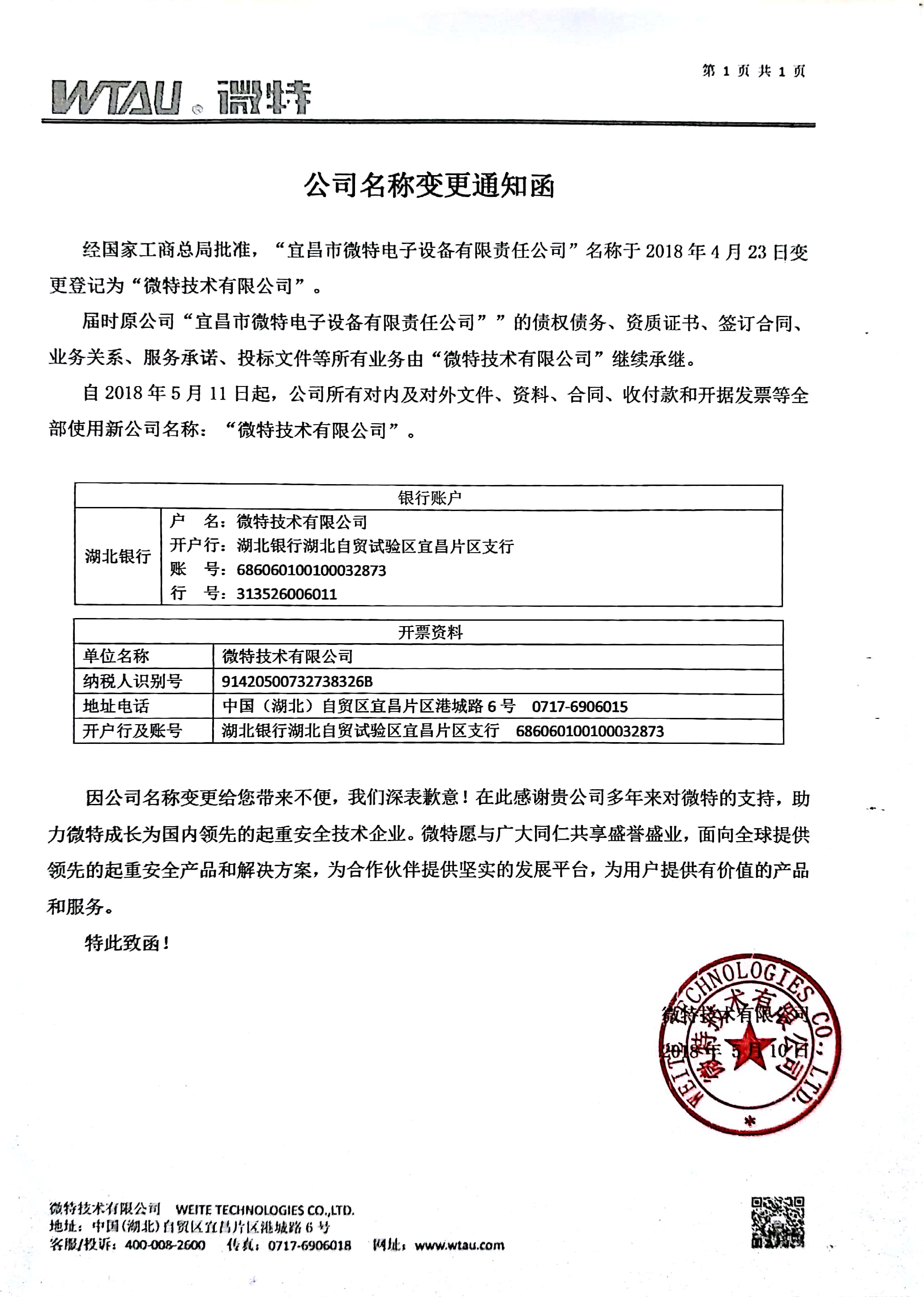 注:自2018年5月11日起,原公司“宜昌市微特電子設備有限責任公司””的債權債務、資質證書、簽訂合同、業務關系、服務承諾、投標文件等所有業務由“微特技術有限公司”繼續承繼。公司所有對內及對外文件、資料、合同、收付款和開據發票等全部使用新公司名稱:“微特技術有限公司”。