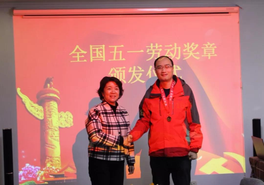 宜昌市總工會黨組成員、女職工委員會主任朱利民為勞模高鈺敏頒發全國五一勞動獎章