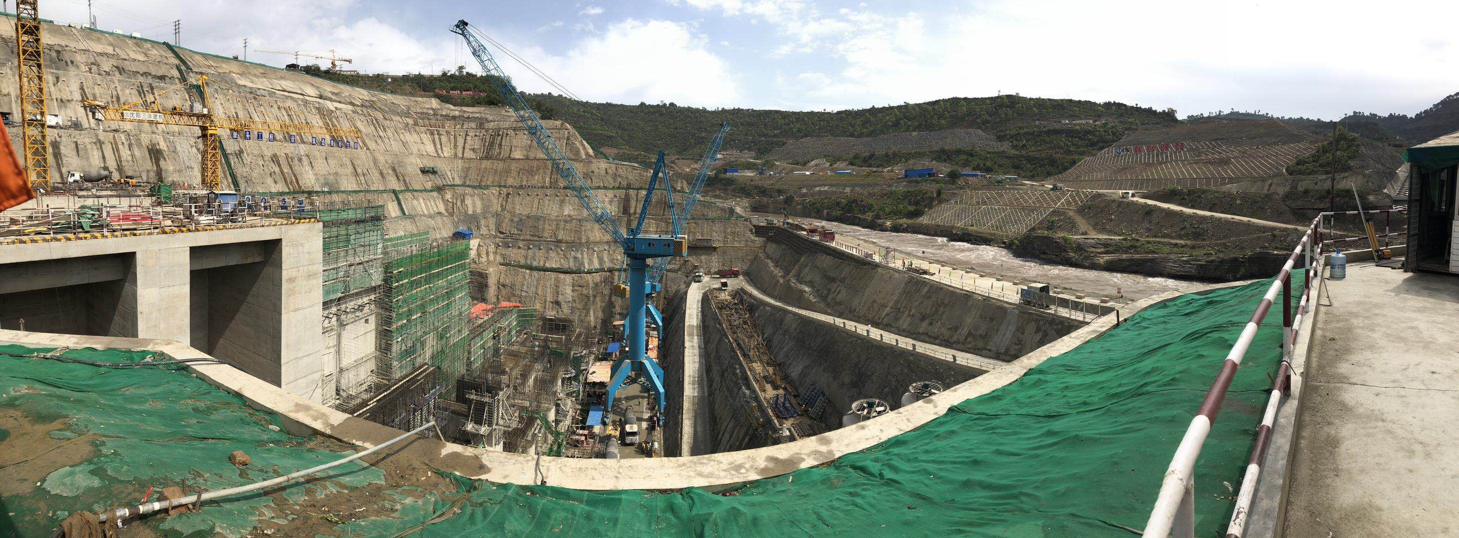 ▲卡洛特水電站現場施工塔機及門座式起重機