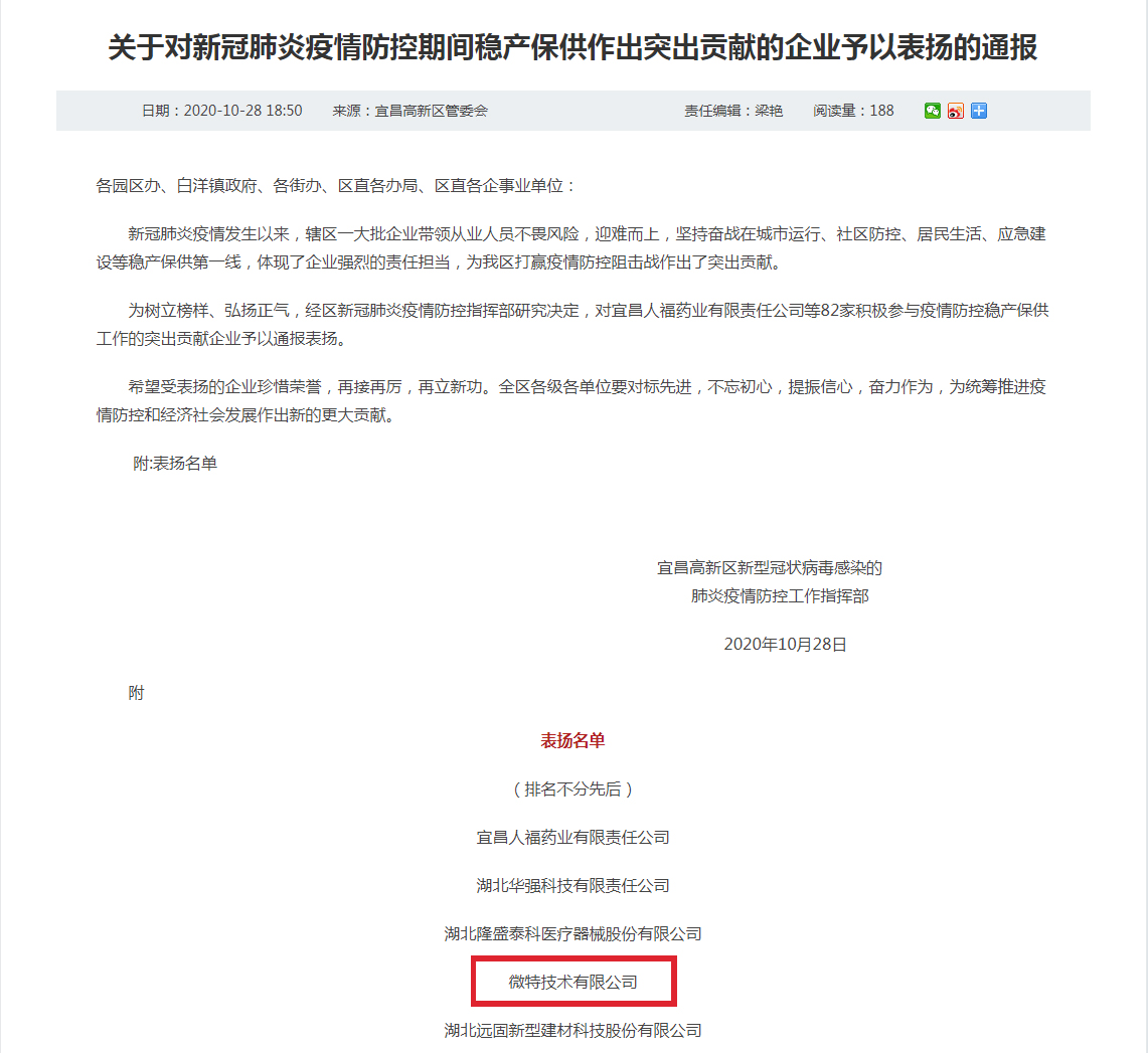 近期,宜昌高新區(qū)新型冠狀病毒感染的肺炎疫情防控工作指揮部發(fā)布了《關(guān)于對(duì)新冠肺炎疫情防控期間穩(wěn)產(chǎn)保供作出突出貢獻(xiàn)的企業(yè)予以表揚(yáng)的通報(bào)》,微特技術(shù)有限公司位列表揚(yáng)名單。