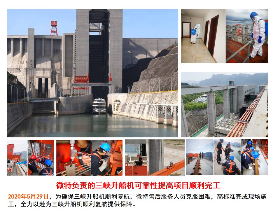 在這特殊的一年里,微特人攻堅克難完成全球規模最大、技術難度最高的三峽升船機的閘首橋機可靠性提高項目,為三峽升船機順利復航提供保障;微特人敢為人先承接定制化攀鋼起重機智能運維系統、振華重工卸船機稱重系統等重大項目,貼身為一流鋼鐵船舶企業服務;微特人開拓進取與中水七局、中建四局等企業合作研發起重機運行關鍵技術項目取得重大突破;微特人勤勉努力不斷深化與全球最大石油生產公司沙特 Aramco、全球頂級起重機品牌DEMAG、Liebherr之間的合作,成果豐碩。