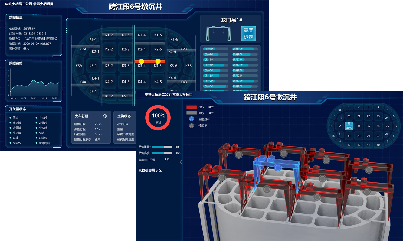 微特今年下半年與項目部多次溝通,與總工反復(fù)進(jìn)行技術(shù)協(xié)商及推演,最終決定使用龍門吊來監(jiān)測泥面高度,通過三維定位龍門吊的方案,找到每個龍門吊在沉井上的坐標(biāo),再結(jié)合卷揚機的高度變化,來實現(xiàn)每日單天每個井孔的最大深度測量,達(dá)到自動測量自動生產(chǎn)數(shù)據(jù)報表功能,使得沉井下沉高度自動可視可測。