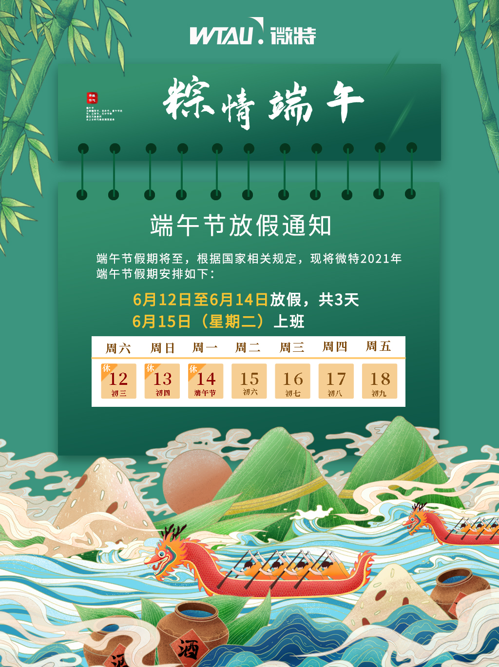 粽香送祝福,情暖端午節!值此端午節來臨之際,根據國務院辦公廳通知精神,并結合微特公司實際情況,現將2021年端午節放假安排通知如下: