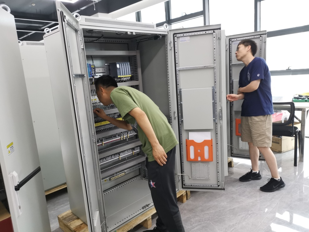 大朝山電站驗收代表在微特電氣車間檢查盤柜生產工藝以及微特電氣工程師對變頻控制柜進行上電試驗