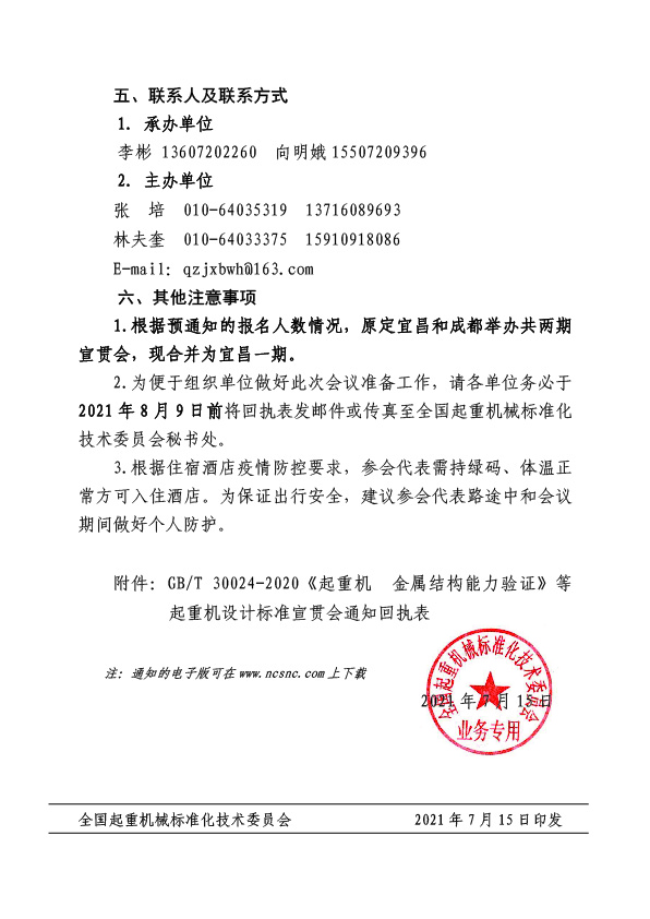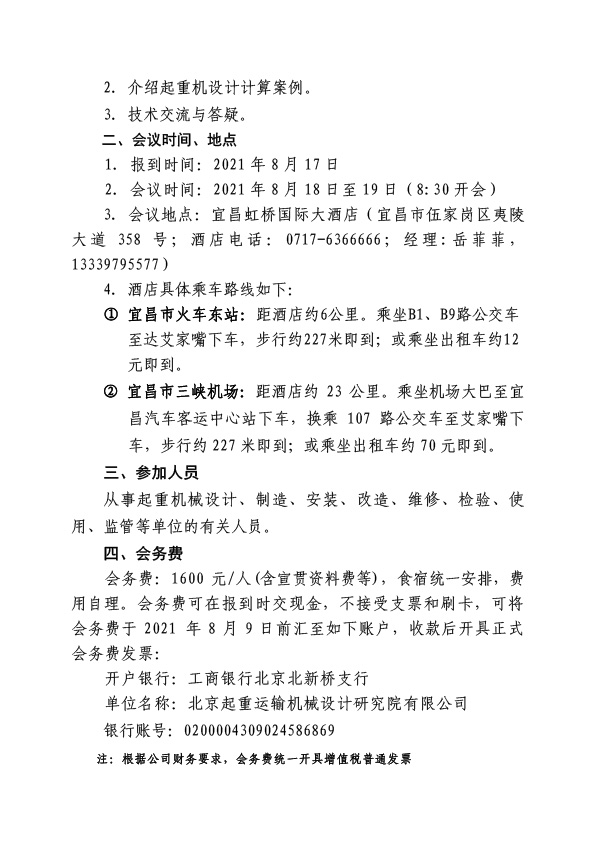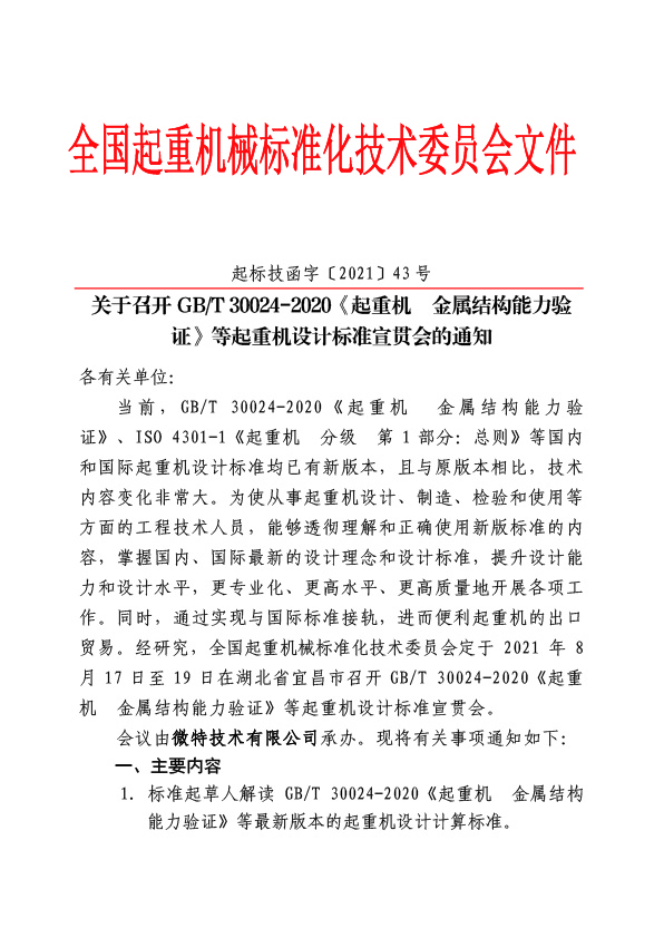 為使從事起重機設計、制造、檢驗和使用等方面的工程技術人員,能夠透徹理解和正確使用新版標準的內容,掌握國內、國際最新的設計理念和設計標準,提升設計能力和設計水平,更專業化、更高水平、更高質量地開展各項工作,全國起重機械標準化技術委員會針對起重機分級、剛性、金屬結構能力驗證等方面的設計計算標準,將于2021年8月18日至19日在湖北宜昌召開標準宣貫會。