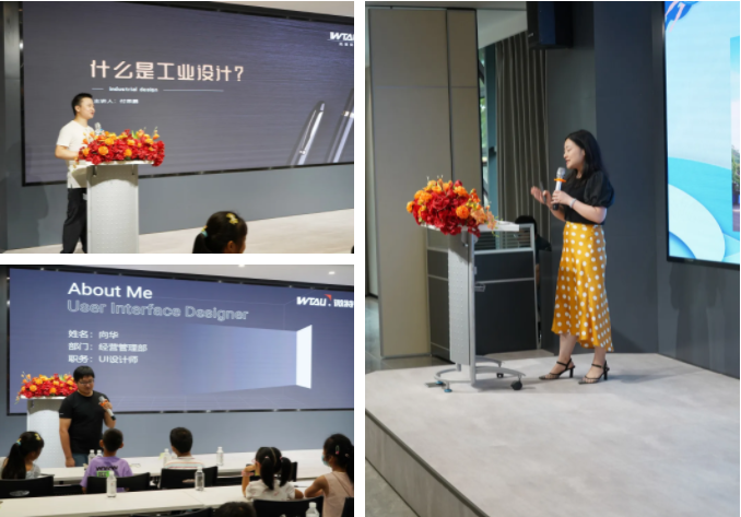 第三站在工業設計中心會議室,由微特工業設計師、UI設計師以及外貿銷售的三位老師分別為孩子們介紹什么是工業設計?UI是什么?以及外貿是怎么做的?讓孩子們感受到了未來的多樣性,也希望通過這些演示啟發孩子們,讓他們找到自己真正的興趣所在,在今后的學習中能夠找到為之努力的方向。