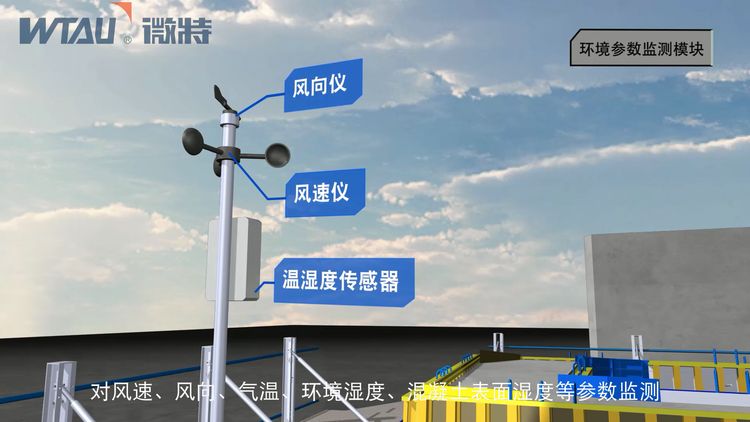 環境參數監測模塊。通過安裝風速風向儀、溫濕度傳感器等對風速、風向、氣溫、環境濕度、混凝土表面濕度等參數監測,系統對數據進行自動采集、處理及分析,指導施工作業。