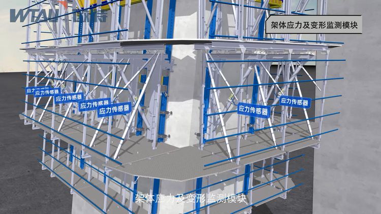 架體應力及變形監測模塊。布置傳感器對架體關鍵受力桿件進行應力及變形監測并提供超限預警,確保架體受力安全;布置重量傳感器監測模架上層結構的重量及偏載;布置傾角傳感器對架體平臺進行水平度監測,嚴防架體姿態失衡。