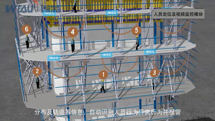 人員定位及視頻監控模塊。通過定位標簽及360視頻安全監控手段,實時監測及顯示造塔平臺上人員數量、分布及軌跡等信息,自動識別人員行為異常行為并報警。