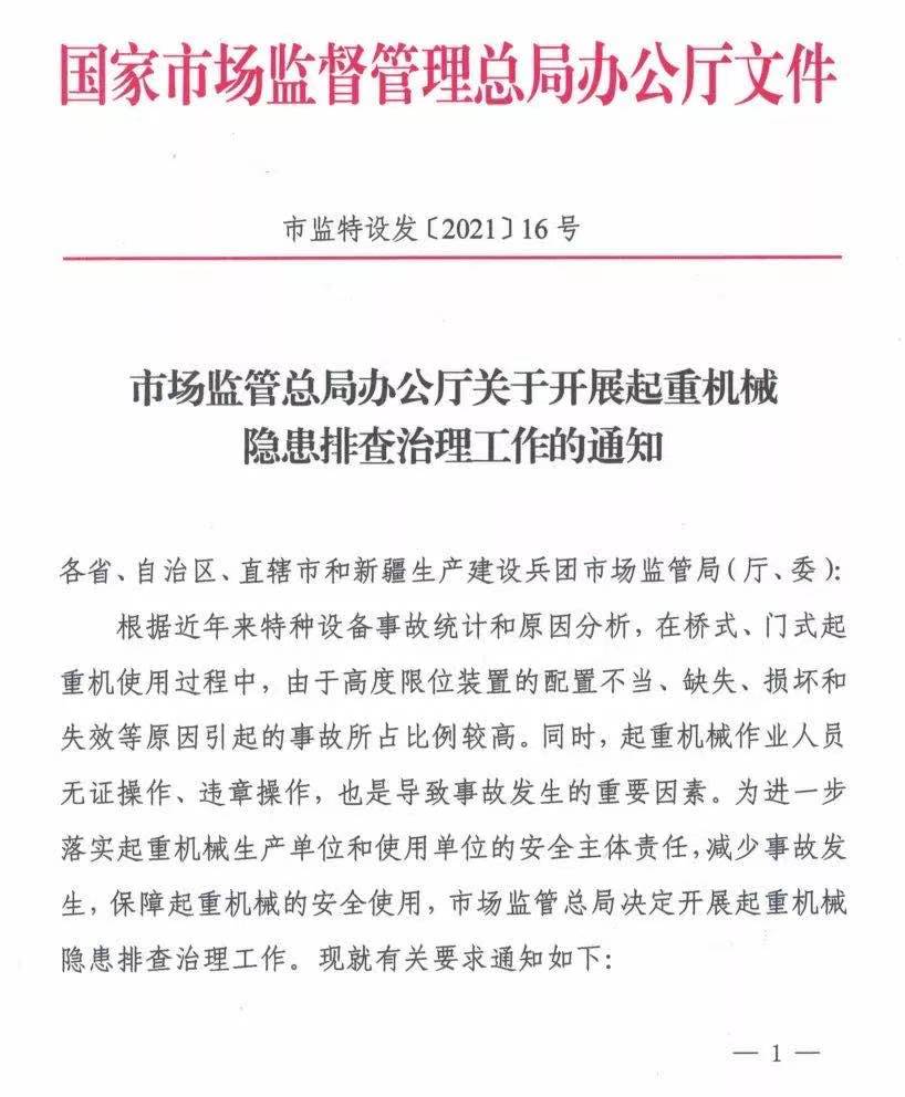 通知要求,自2021年5月1日起,起重機械生產單位對新出廠的橋式、門式起重機,應當同時安裝兩種不同形式的高度限位裝置,如重錘式、斷火式、壓板式高度限位器等任意兩種。