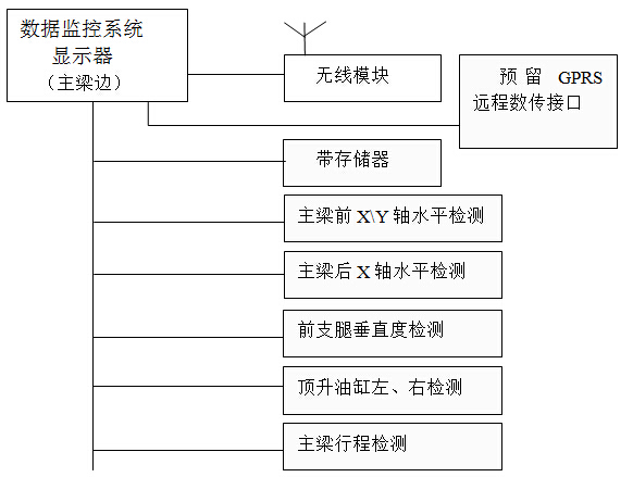 由于該拼裝架橋機(jī)的特殊性,本套系統(tǒng)方案配備有信號(hào)采集裝置(下位機(jī))1臺(tái)和一套圖形顯示終端含存儲(chǔ)(上位機(jī)),能夠?qū)崟r(shí)的顯示所監(jiān)控的各個(gè)參數(shù),并對(duì)所有的監(jiān)控對(duì)象能作出顯示、報(bào)警、數(shù)據(jù)分析、查詢(xún)、記錄及動(dòng)作輸出等功能。數(shù)據(jù)保存能保存30個(gè)連續(xù)工作日。設(shè)備數(shù)據(jù)具有導(dǎo)出功能,通過(guò)USB口或網(wǎng)口可將數(shù)據(jù)導(dǎo)出作為長(zhǎng)久保存用。設(shè)備具備遠(yuǎn)程通訊接口,可將數(shù)據(jù)和視頻通過(guò)GPRS或3G模塊將數(shù)據(jù)發(fā)至服務(wù)器,實(shí)現(xiàn)遠(yuǎn)程監(jiān)控。