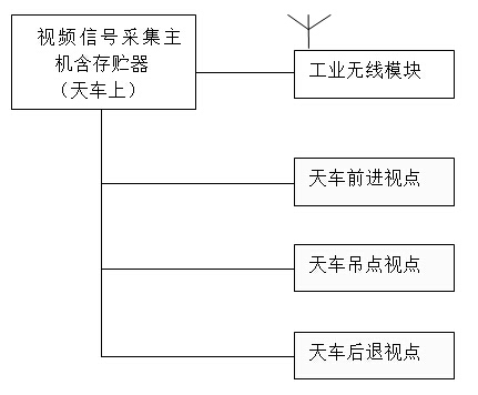 本方案視屏系統(tǒng)的配置結(jié)構(gòu)主要有:3路攝像頭和存儲(chǔ)器、、無(wú)線(xiàn)模組、顯示器等主體結(jié)構(gòu)構(gòu)成。主要監(jiān)視天車(chē)前行區(qū)域、天車(chē)后退區(qū)域、天車(chē)吊點(diǎn)區(qū)域的工作面為主要監(jiān)視區(qū)域,信號(hào)通過(guò)無(wú)線(xiàn)模塊傳輸至安裝在大梁上的視屏顯示器顯示