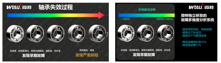目前市場上,一般通過常規(guī)振動、噪音,才能發(fā)現(xiàn)軸承嚴重缺陷。微特獨立研發(fā)的故障多維度分析系統(tǒng),通過包絡(luò)譜、濾波解調(diào)法、高頻共振解調(diào)、強度譜、綜合譜,能在早期就發(fā)現(xiàn)軸承故障。能有效地提高生產(chǎn)安全性、提高生產(chǎn)與管理效率、降低故障停機率45%、降低維修費30%,幫助企業(yè)降低生產(chǎn)、管理、運營等成本,提升利潤。