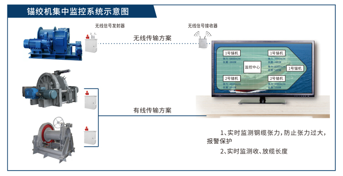 大型工程船、浮吊、油輪、躉船、錨地等工程設施在施工、靠泊、牽引、??繜o人值守時,會采用絞纜機張拉纜繩就位、固定,絞纜機牽引力與剎車制動力距需要實時監測,并在過載時發出明顯的警報、可以在超力矩時有計劃的松閘釋放部分力矩,保障纜繩、錨機、船舶不出事故。