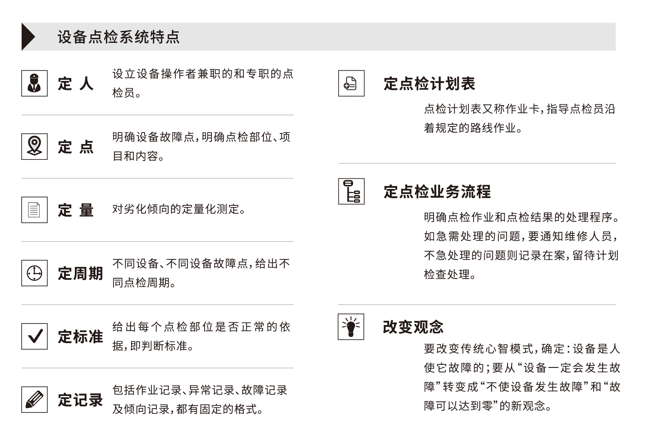 點檢是車間設備管理的一項基本制度,目的是通過點檢準確掌握設備技術狀況,維持和改善設備工作性能,預防事 故發生,減少停機時間,延長設備壽命,降低維修費用,保證正常生產。