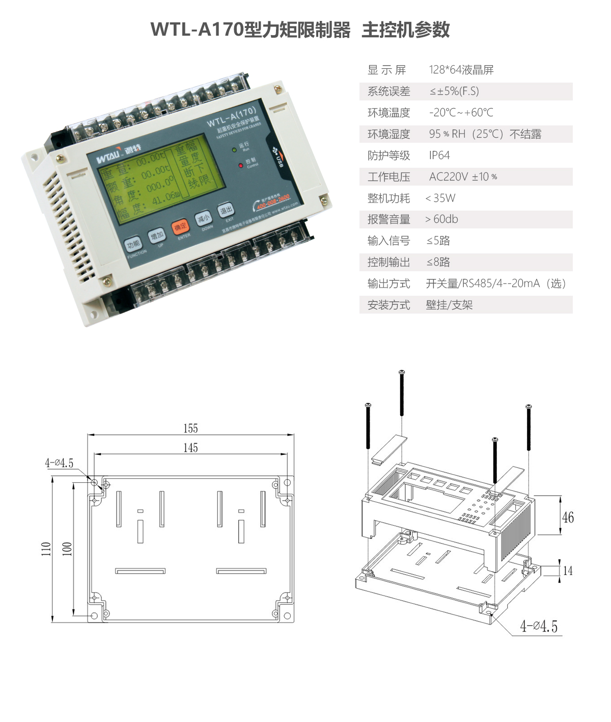 WTL-A170力矩限制器產(chǎn)品特別適用于用于雙搖臂抱桿、汽車吊、港口門座式起重機(jī)(鷹嘴吊)、履帶吊、固定吊、輪胎吊、桅桿吊等監(jiān)控信號(hào)較多的起重設(shè)備。