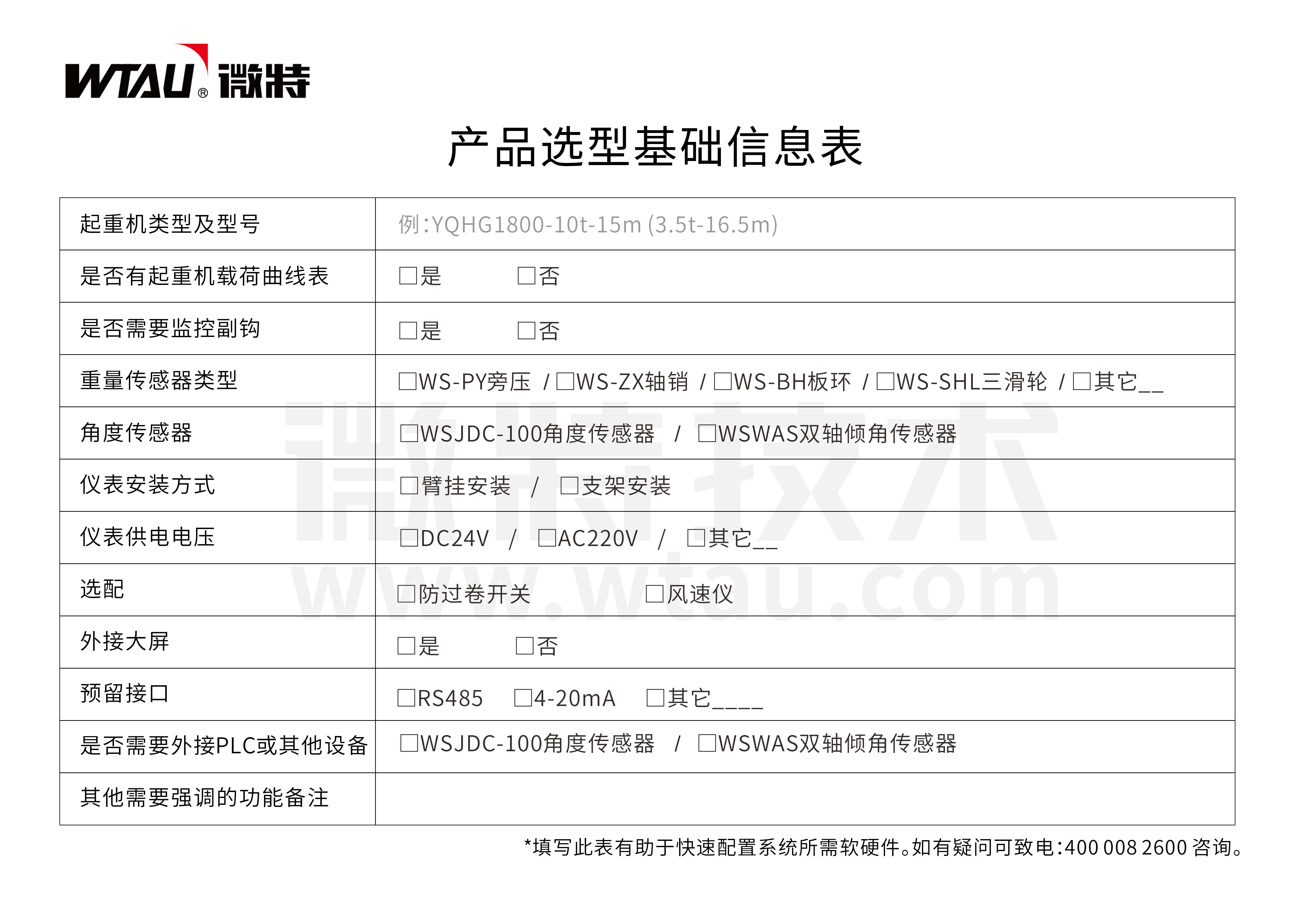 WT-W650V3型力矩限制器采用模塊化結(jié)構(gòu),由重量傳感器、角度傳感器、信號傳輸電纜、微電腦主機(jī)(含電源、顯示、信號處理)等部分組成。適用于在惡劣環(huán)境中運(yùn)行的工況復(fù)雜的起重設(shè)備。