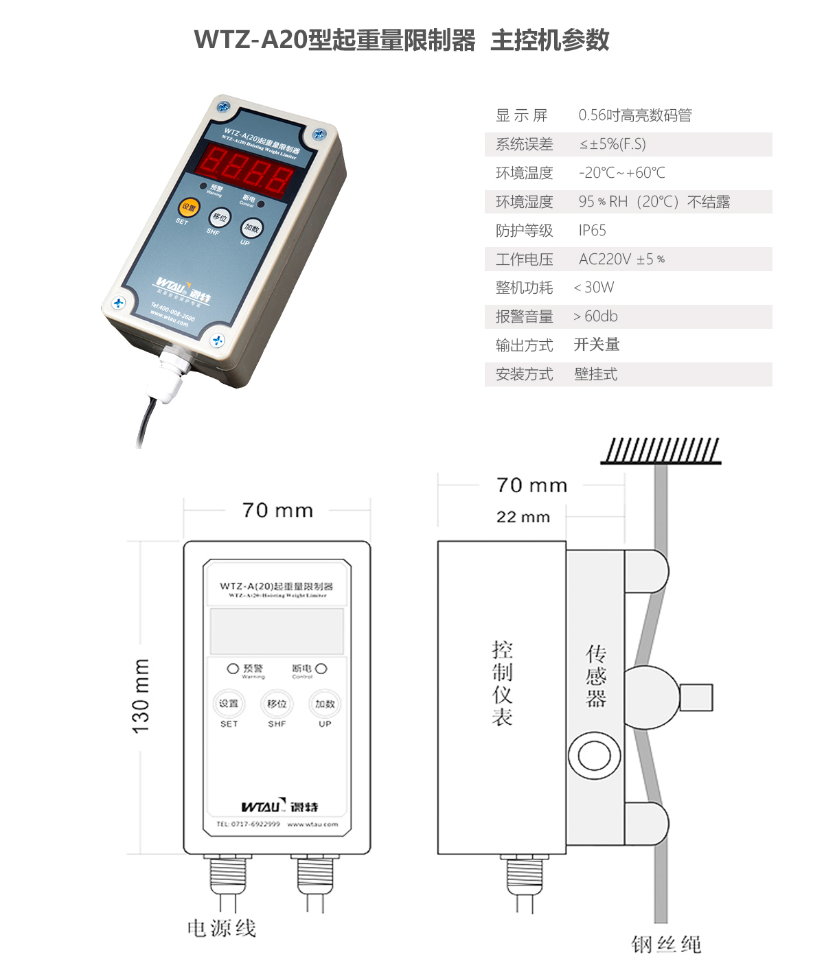WTZ-A20起重量限制器用于一路重量信號(hào)監(jiān)測,適用于升降機(jī)、電動(dòng)葫蘆等鋼絲繩置吊的起重設(shè)備。該型號(hào)儀表可替換WTZ-A50、WTZ-A60起重量限制器使用。