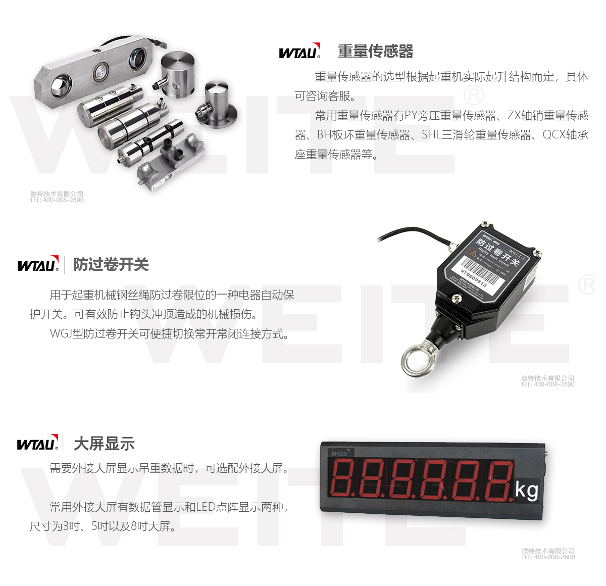WTZ-A200起重量限制器由主機(jī)儀表,重量傳感器,防過卷開關(guān)(選配),外置大屏(選配)以及電源信號(hào)線纜等組成。