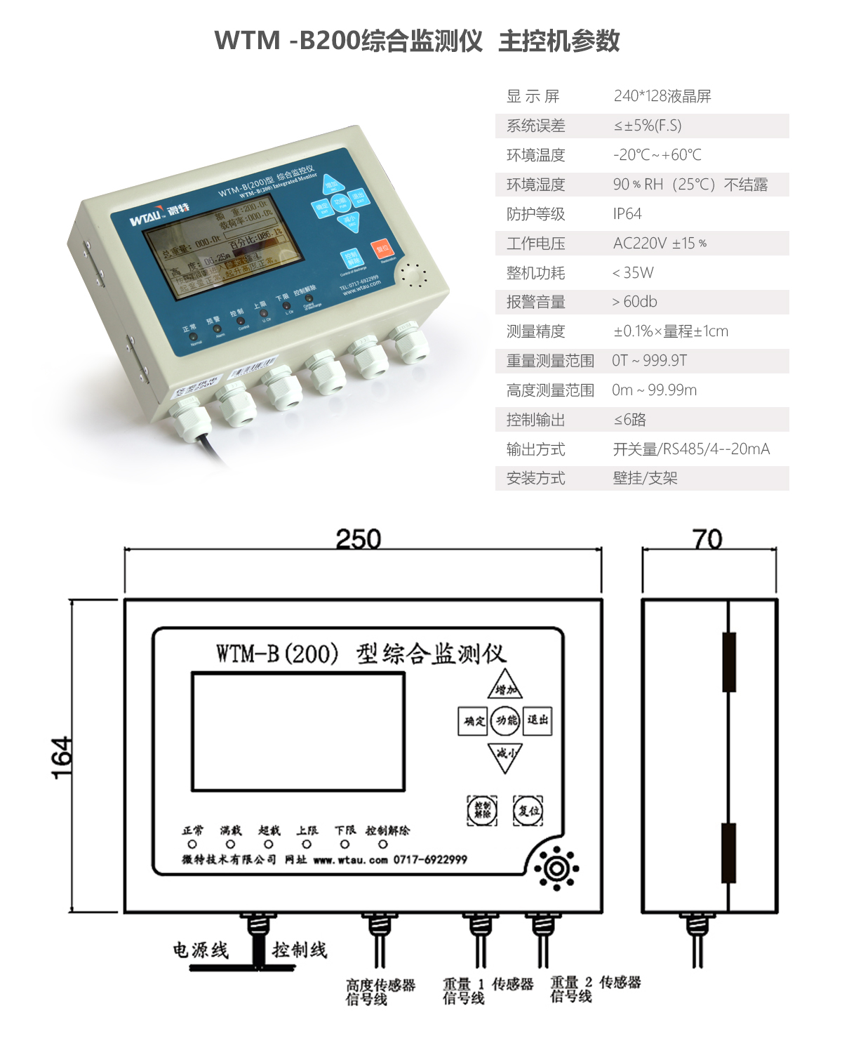 WTM-B200水電站綜合監控儀可以輸入重量、高度、風速、風向、角度、幅度、溫度等信號,最多可輸出6個繼電器控制。適用于卷揚啟閉機多路重量及開度信號的控制。