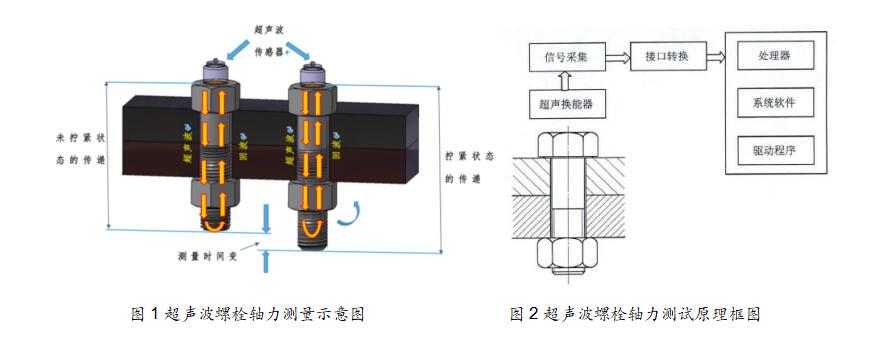 公式中v為機械縱波在螺栓內的傳播速度。圖1為超聲波螺栓軸力測量示意圖,圖2 超聲波螺栓軸力測試原理框圖。