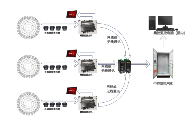螺栓預緊力在線監測系統是根據聲彈性理論,通過測量超聲波在螺栓等緊固件中傳輸時間的變化,計算出螺栓應力、軸力、伸長量等數值。結合數字、可視化報表組合的形式展示各個監測設備的最新監測數據,給出報警信息。