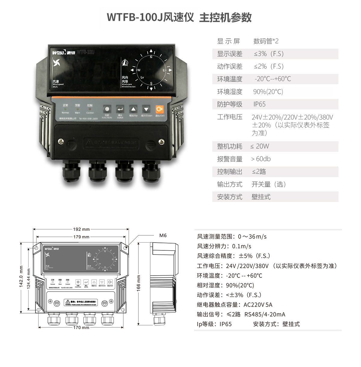 WTFB-100J風速報警儀監測風速范圍為0~36m/s。產品穩定性高、抗干擾能力強,檢測精度高,風杯機械強度高、抗風能力強,顯示器機箱設計新穎獨特,堅固耐用,安裝時免調試,適用于不同工作環境的大風監測報警及控制。