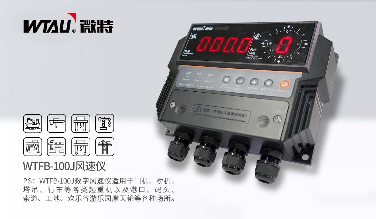 WTFB-100J風速報警儀用于監測瞬時風速和平均風速,具有自動監測、實時顯示、超限報警和控制等功能。適用于門機、橋機、塔吊、行車等各類起重機以及港口、碼頭、索道、工地、歡樂谷游樂園摩天輪等各種場所。