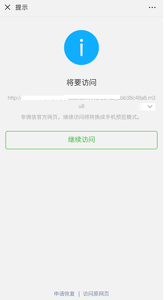 騰訊云放回的m3u8地址是一個(gè)直播的視頻流地址,直接播放會(huì)在微信頁(yè)面有一個(gè)【繼續(xù)訪(fǎng)問(wèn)】的頁(yè)面提示;