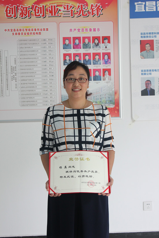楊英同志擔(dān)任宜昌市微特電子設(shè)備有限責(zé)任公司倉庫管理員,同時(shí)也是中共宜昌高新區(qū)智能裝備創(chuàng)業(yè)聯(lián)盟黨支部委員。平時(shí)工作兢兢業(yè)業(yè),成績顯著,同時(shí)積極發(fā)揮黨員先進(jìn)性作用,熱心幫助他人,帶動同事共同成長。在黨支部工作中,積極開展“兩學(xué)一做”,并積極擔(dān)任入黨介紹人,發(fā)動身邊的優(yōu)秀人才入黨。