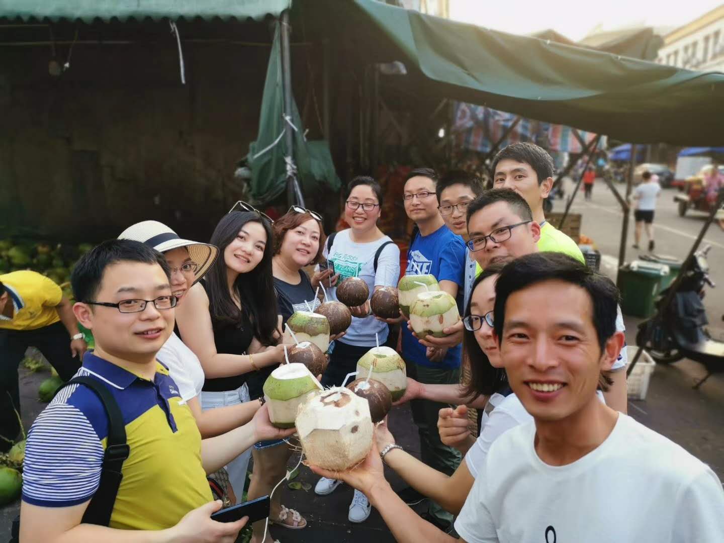 抵達酒店后,有些迫不及待了。下午我們一行就轉了轉周邊的集貿市場還和水果市場,來到椰城肯定少不了的就是一嘗鮮嫩甘甜可口的椰子了,當然也學到如何選好喝的椰子的方法,青椰、紅椰、金椰,紅椰和青椰個頭差不多大,汁水充足,后者有淡淡的甜味兒,前者則微酸,冰凍過后更加美味。椰肉吃起來也是香香脆脆的,不過只有薄薄一層。挑紅椰的時候不一定非要挑大個兒的,小的有很多皮特薄,椰汁不比大的少。