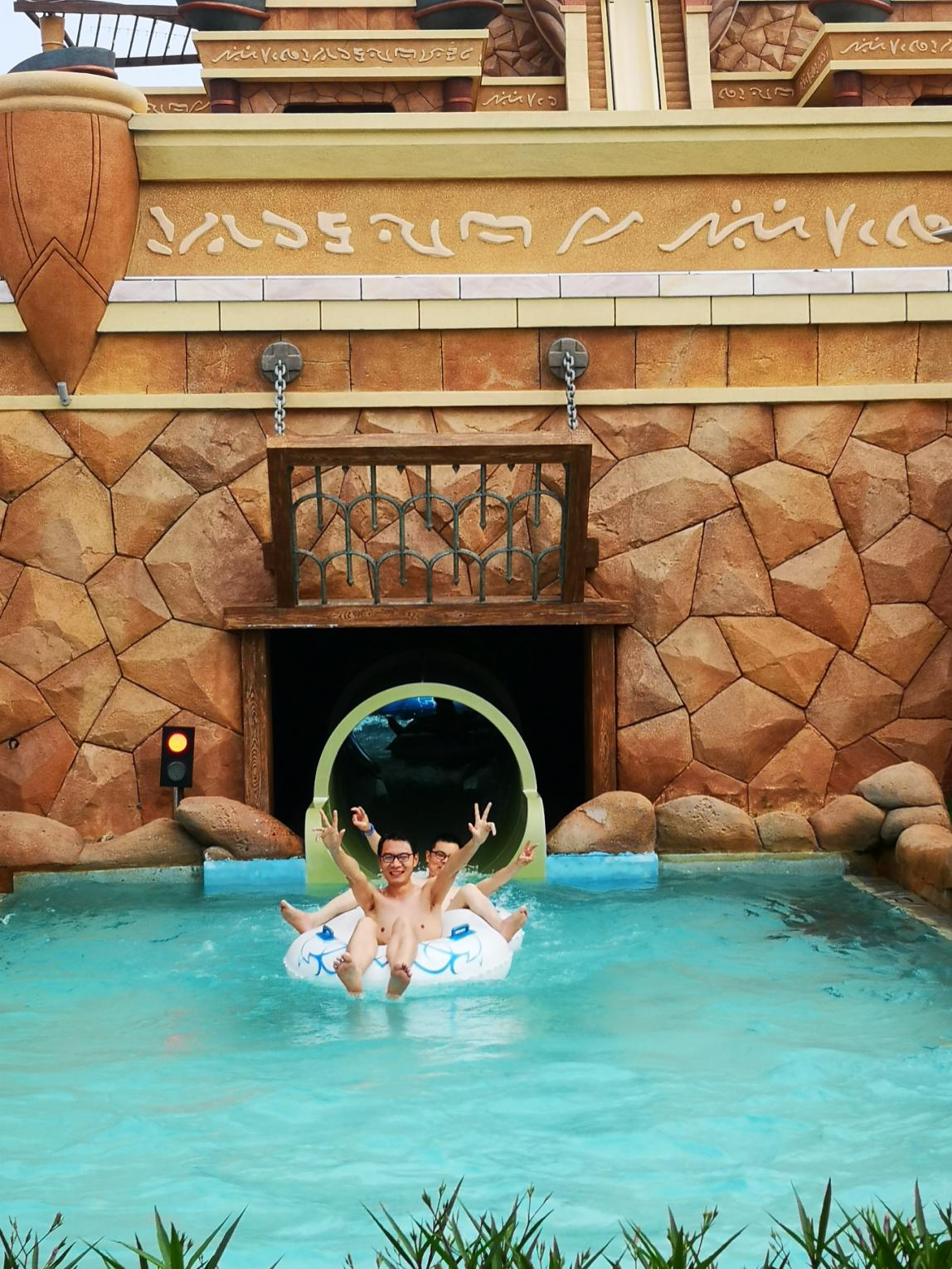 體驗了一下“海神之躍”按照安全員的示范做好準備,雙臂交叉抱緊,雙腿交叉。切記,過程中不能改變姿勢。最后,慢慢往下挪,突然整個人失重,接著大腦一片空白三、四秒后,就已經到達出口了,這幾秒很想知道自己到底經歷了什么。立馬從泳池里爬起來找我們的小伙伴,剛才有拍到嗎,太快了而且距離太遠根本拍不到。