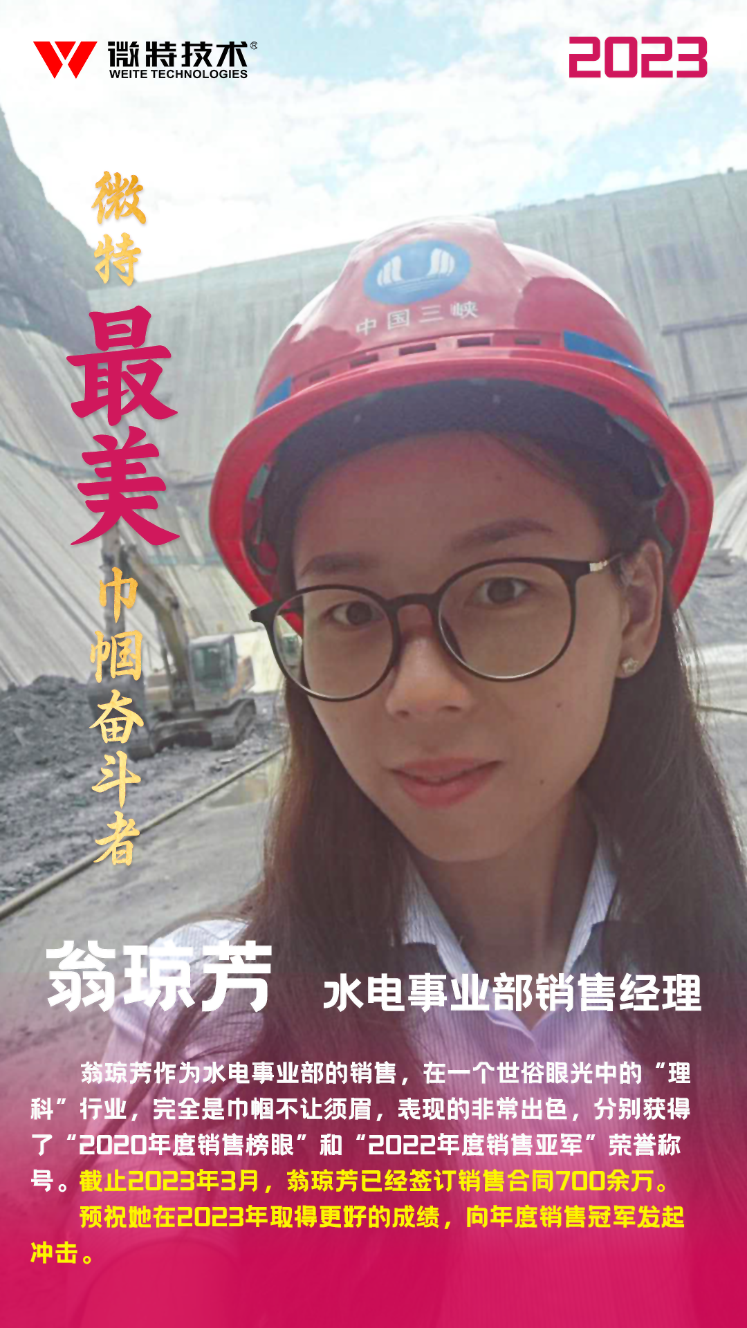 我想起微特公司 “一直致力于為客戶提供有價(jià)值的產(chǎn)品和服務(wù),為客戶提供更加安全可靠的解決方案”的理念與宗旨,原來已經(jīng)潤物細(xì)無聲的浸透到每一位微特人的骨子里。而翁瓊芳作為水電事業(yè)部的銷售,在一個(gè)世俗眼光中的“理科”行業(yè),完全是巾幗不讓須眉,表現(xiàn)的非常出色,分別獲得了“2020年度銷售榜眼”和“2022年度銷售亞軍”榮譽(yù)稱號(hào)。截止2023年3月,翁瓊芳已經(jīng)簽訂銷售合同700余萬,我也預(yù)祝她在2023年取得更好的成績,向年度銷售冠軍發(fā)起沖擊。